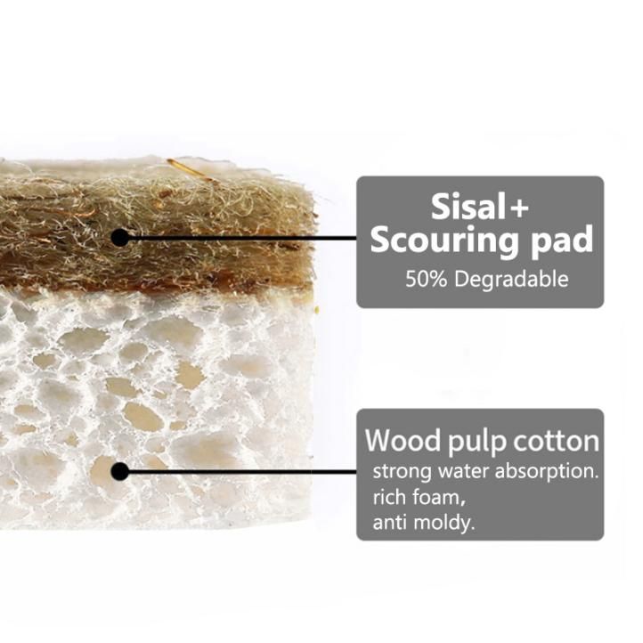 Présentation d'une éponge de cuisine écologique et sans odeur. Ils ne collectent pas les mauvaises odeurs et les bactéries comme les éponges en polyester et les chiffons synthétiques. En raison de la résistance et de la nature abrasive de la fibre de sisal, elle est utilisée dans la partie récurante de nos éponges à base de plantes. Cette éponge de cuisine est composée de cellulose de pâte de bois (partie blanche) et de 50 % de fibres de sisal naturel et 50 % de polyuréthane (partie jaune) pour un récurage intensif.