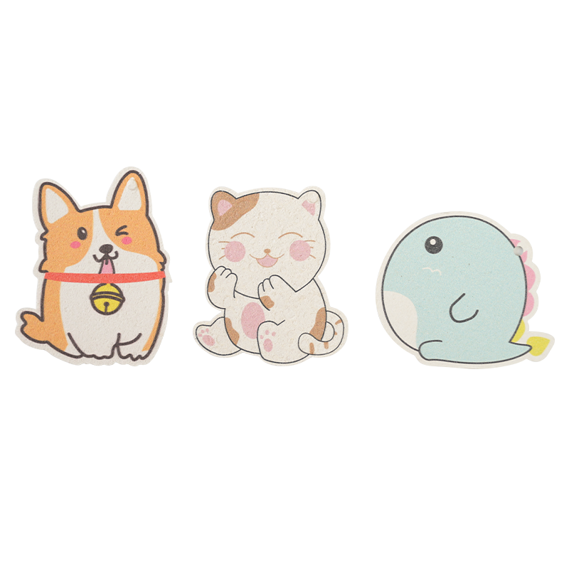 Laissez-moi vous montrer une autre forme d’éponge pour chiots des bois, l’éponge de cellulose compressée. Ceci est produit à partir de pâte de bois de coton après pressage à chaud à haute température. L'éponge de cellulose compressée conserve non seulement tous les avantages de l'éponge de coton en pâte de bois, après pressage, nous réduisons le volume de l'éponge pour réduire les frais d'expédition, nous pouvons également imprimer des logos ou d'autres motifs sur la surface. Cela rend le nettoyage plus amusant.
